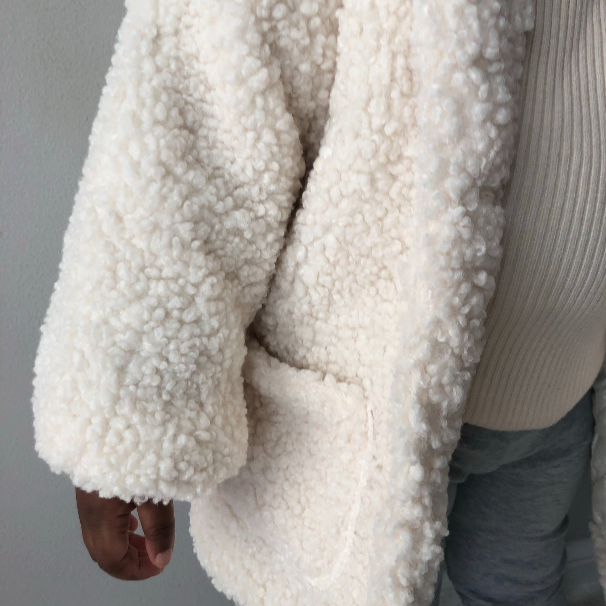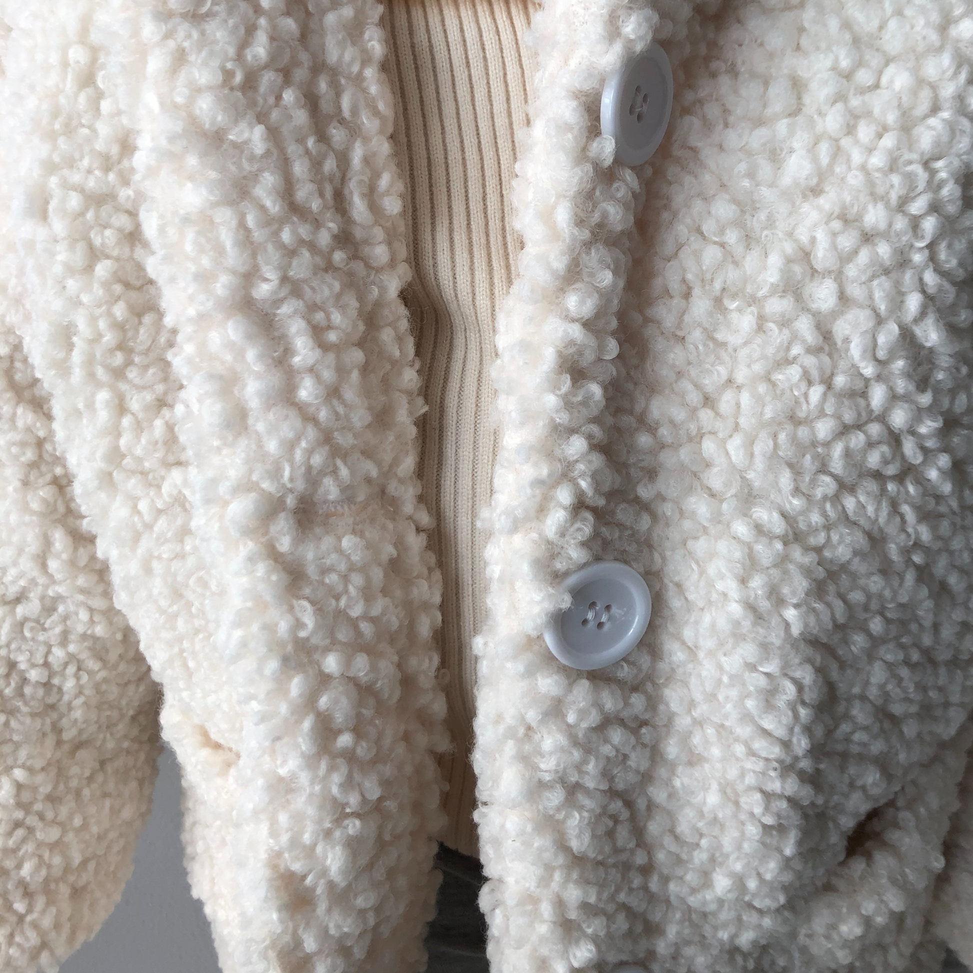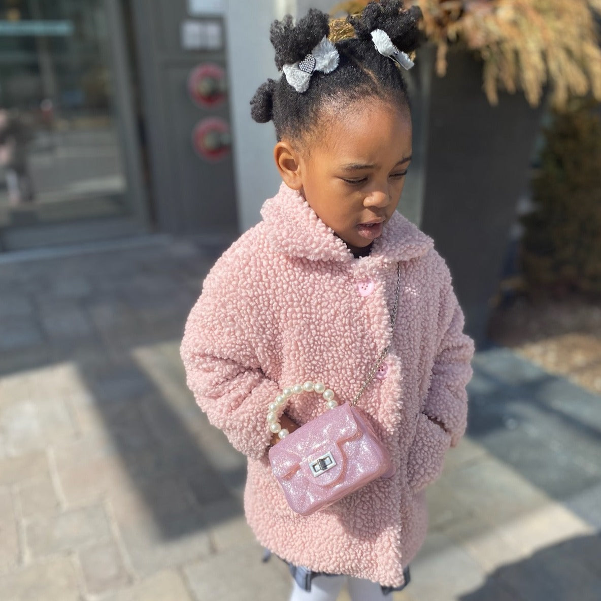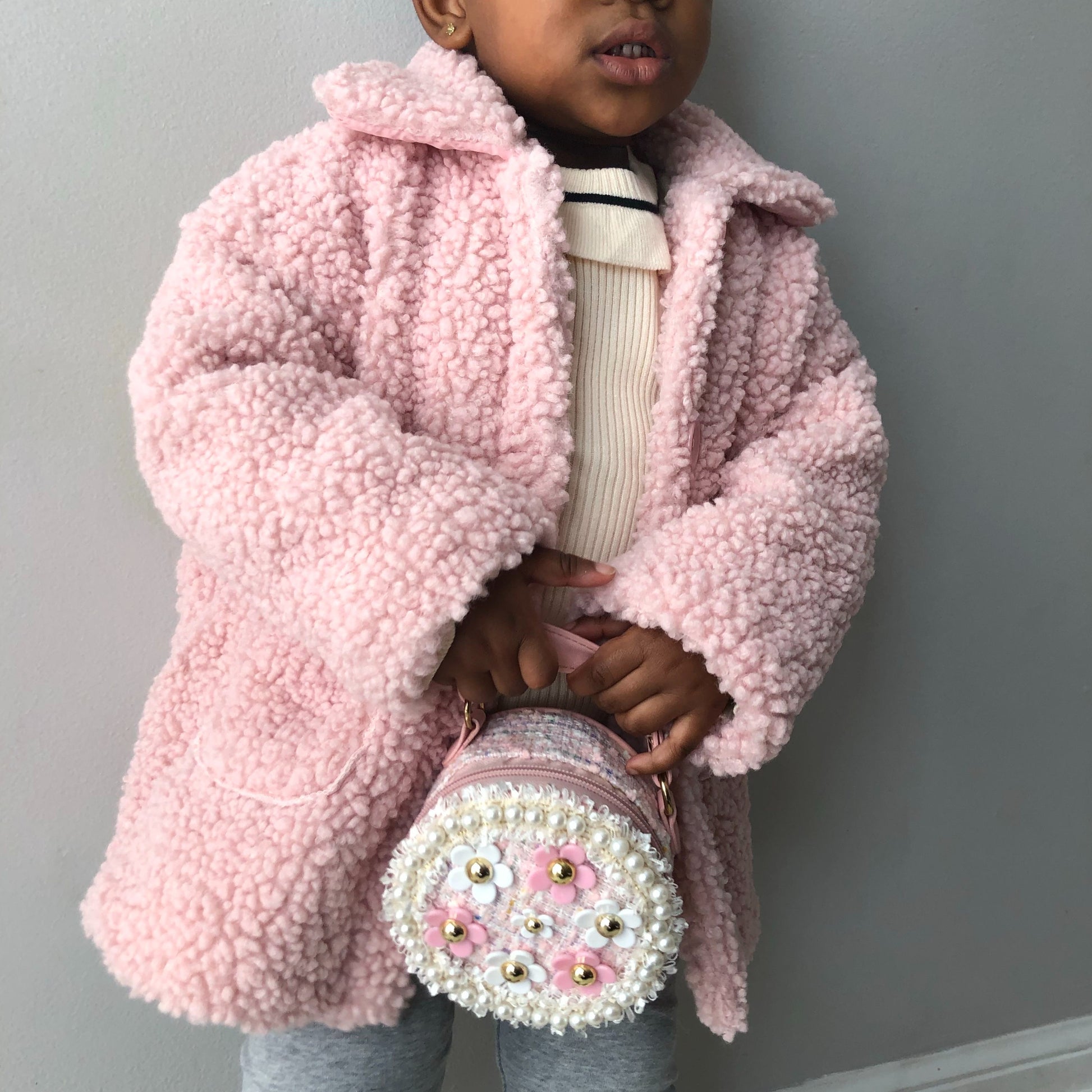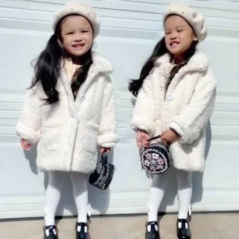 Soft and classic teddy faux fur toddler and kid jacket. Our jacket also has functional buttons and pockets. The pink jacket has pink buttons, the ivory jacket has white buttons.