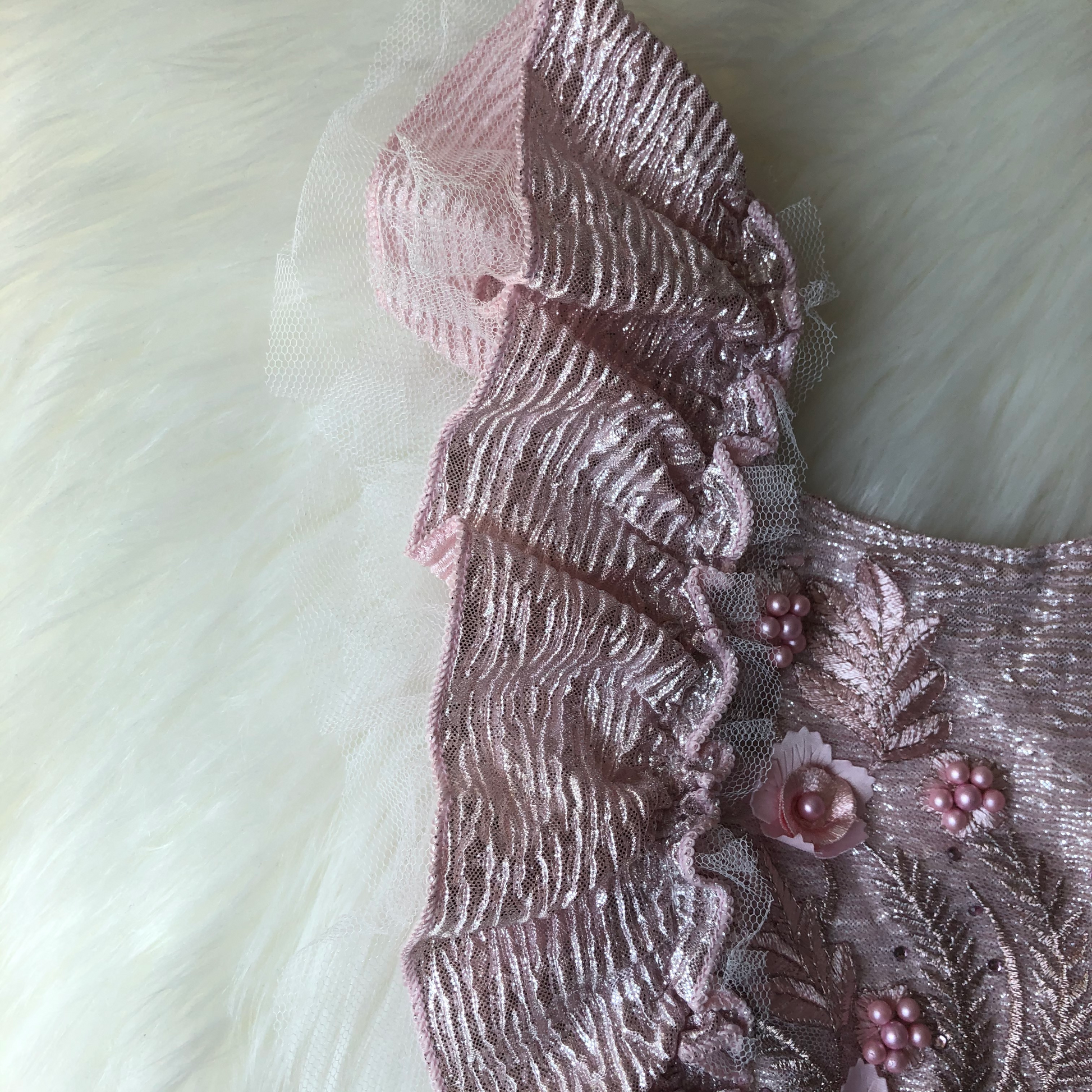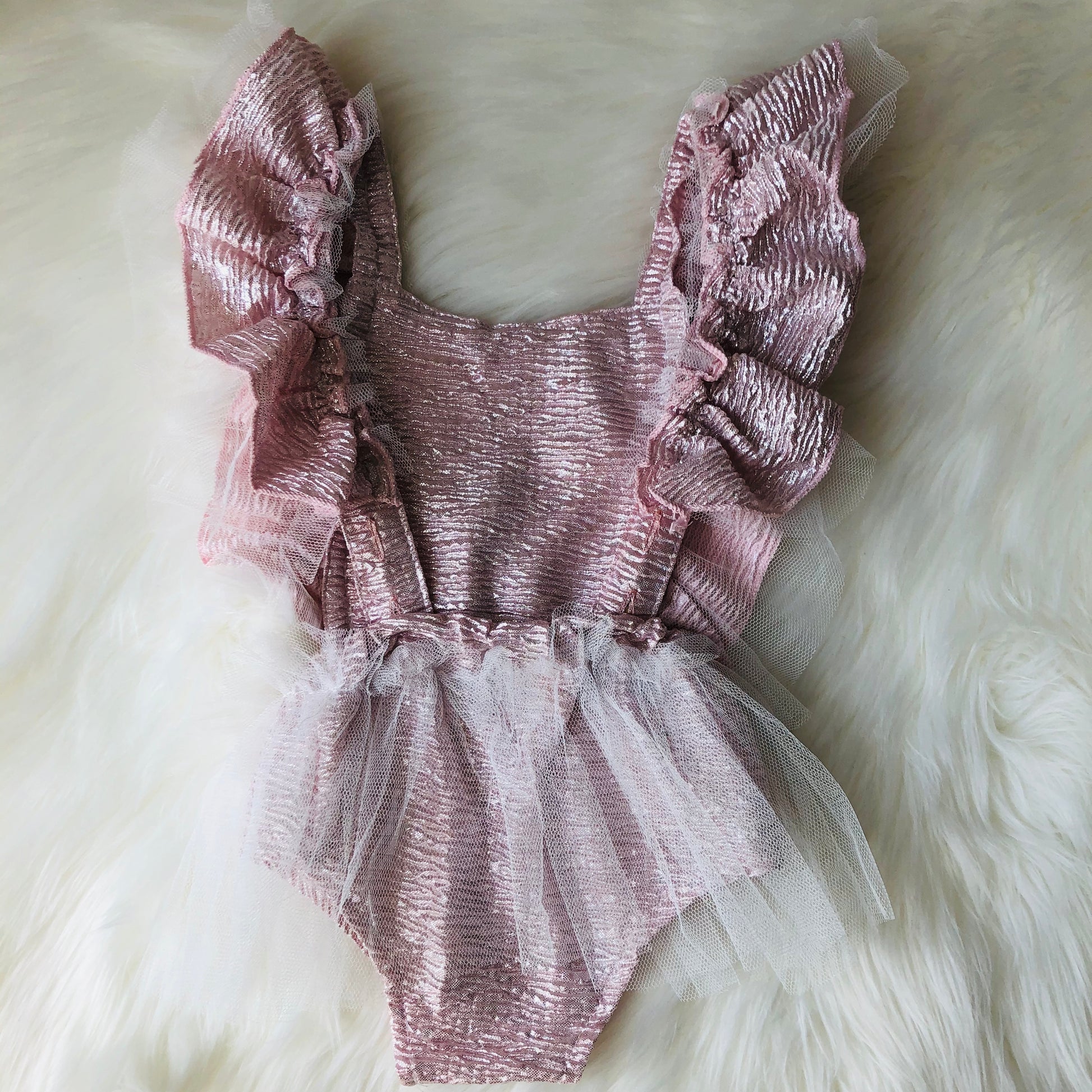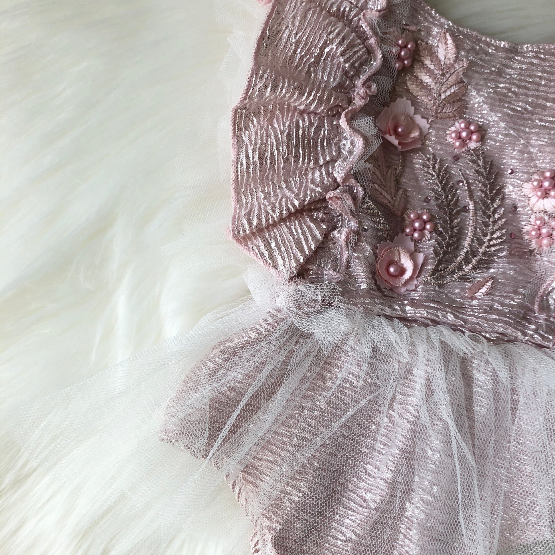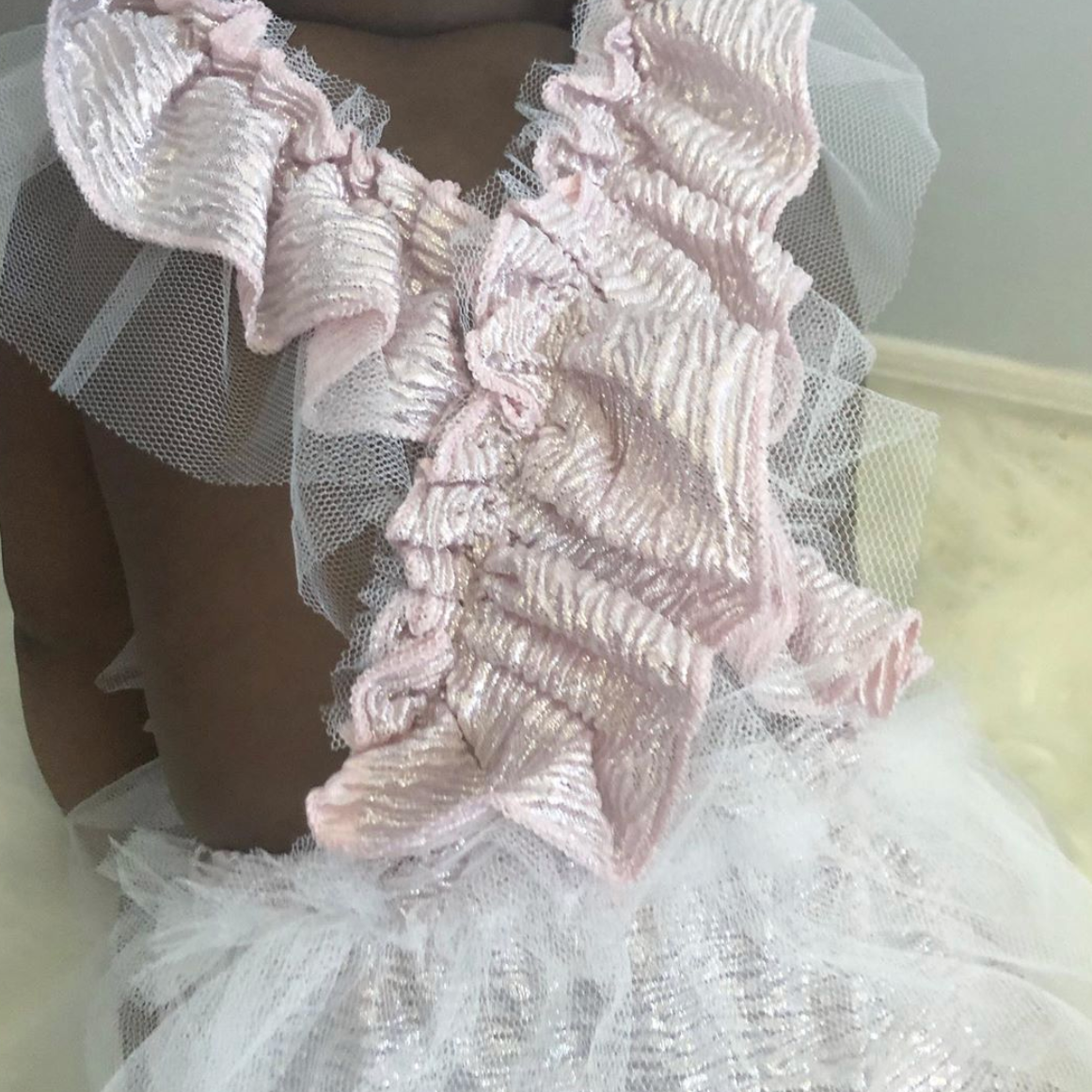 - Sleeveless with a touch of frilly white tulle on the waist and shoulders