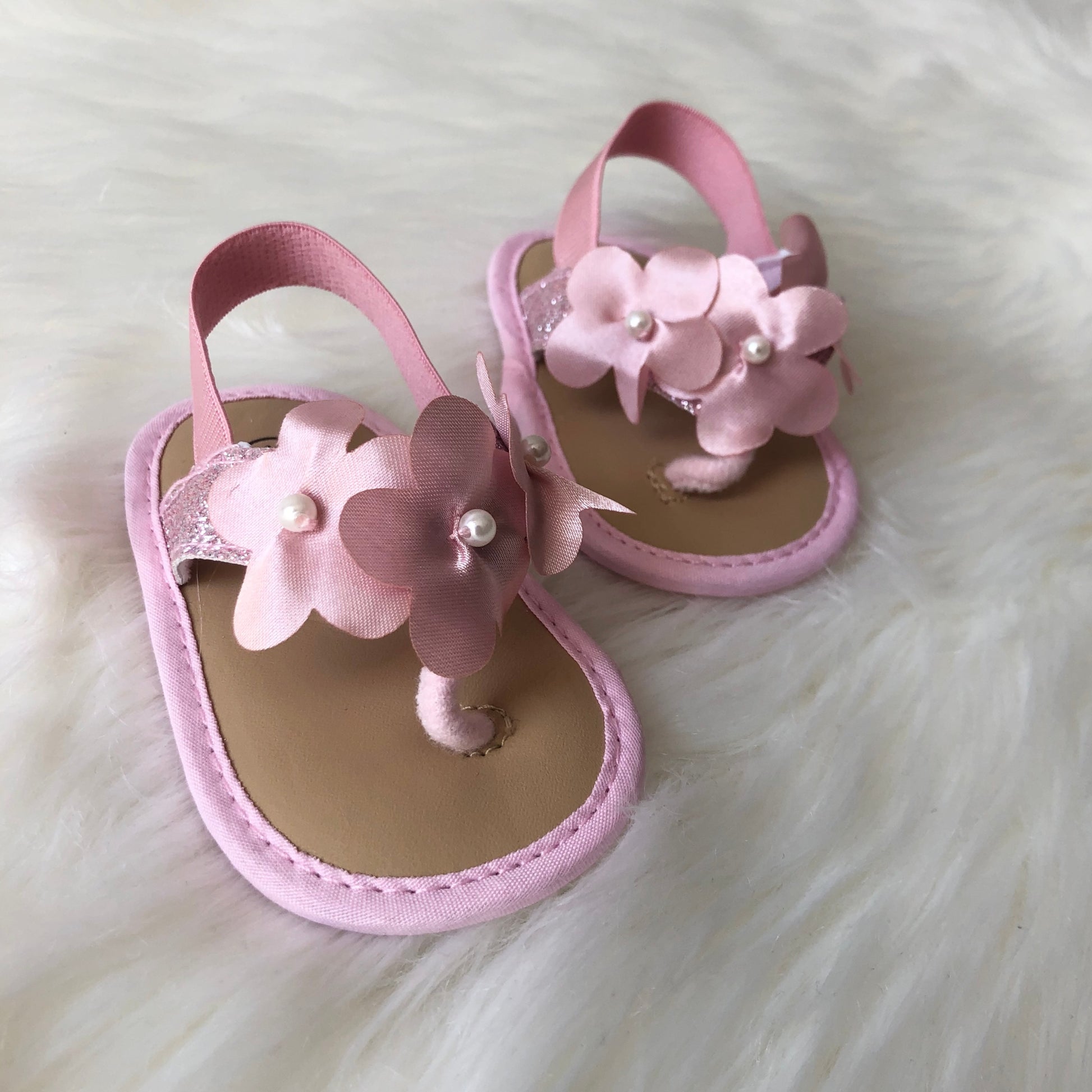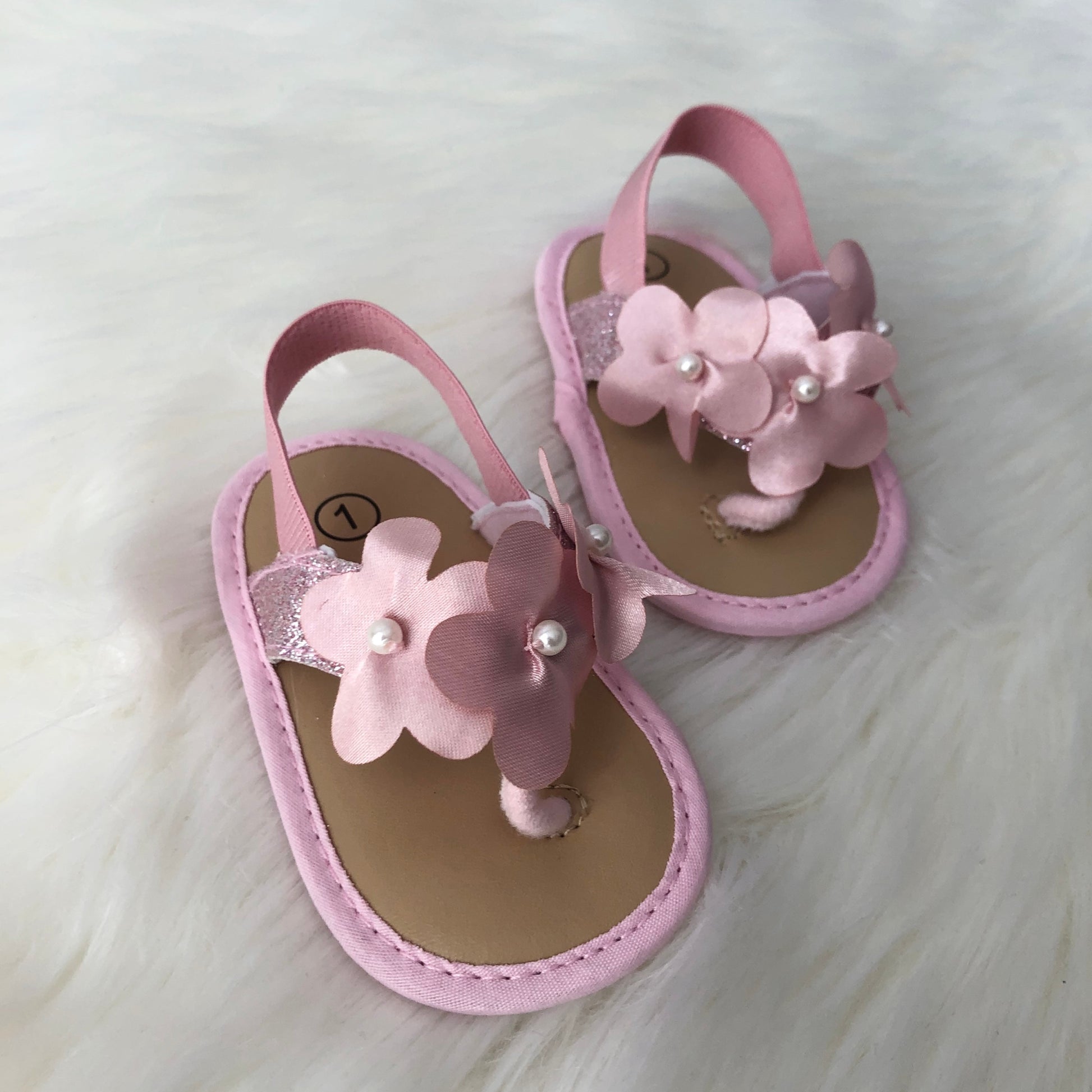 Gorgeous flower slip-on slingback sandals, with pink glitter, pink satin flowers, and a pearl in the center! There is a soft material between the toes to ease any kind of discomfort between the toes. Looks fabulous with our Flower Girl Romper and our other options!