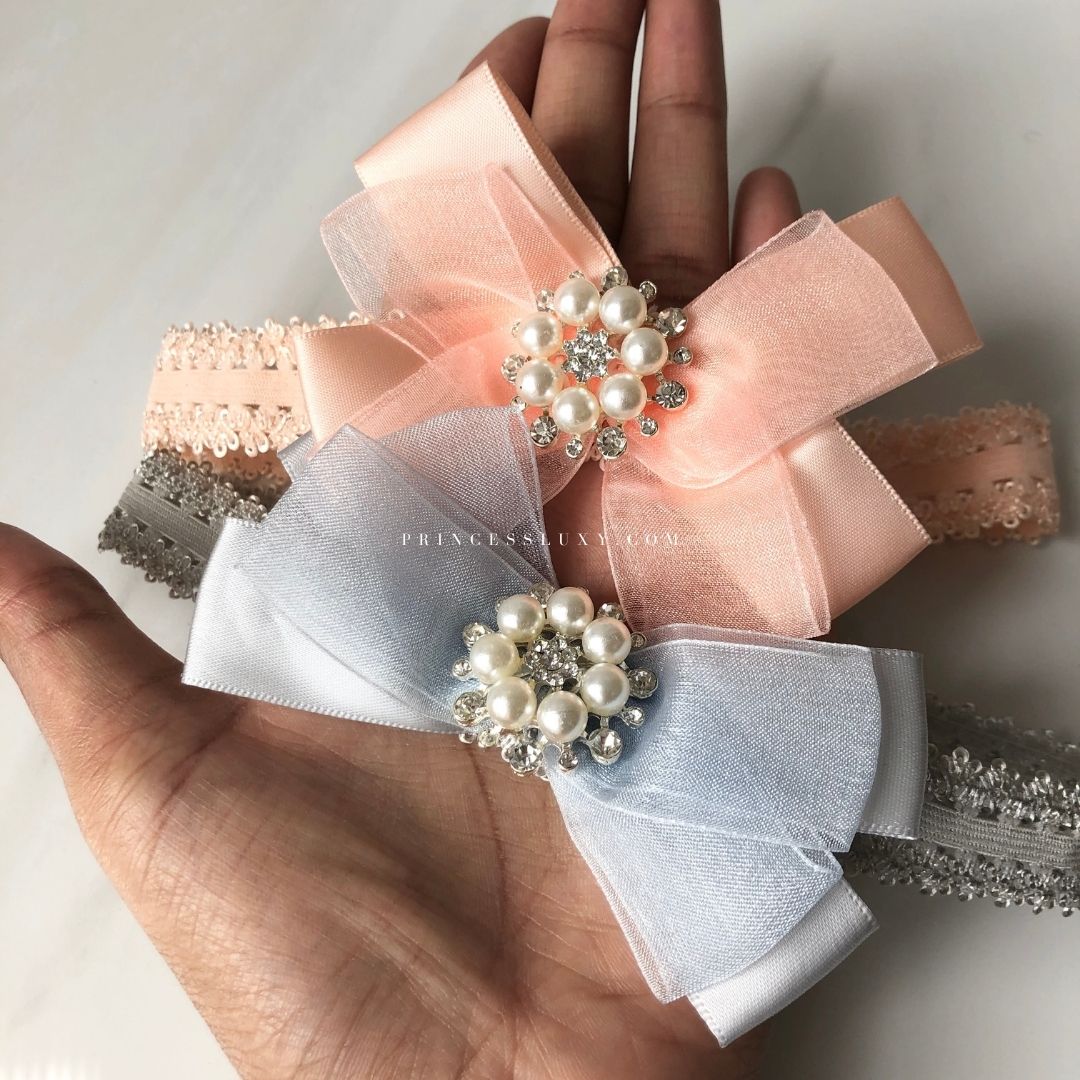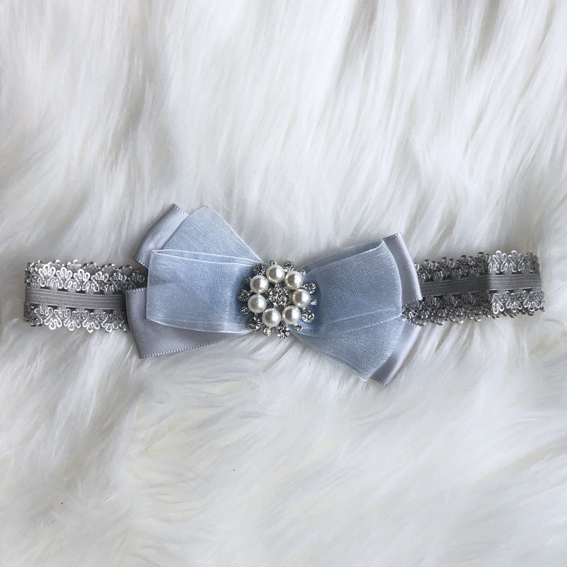 Approximately 3 3/4" wide bow. Available in Grey and in Pink.