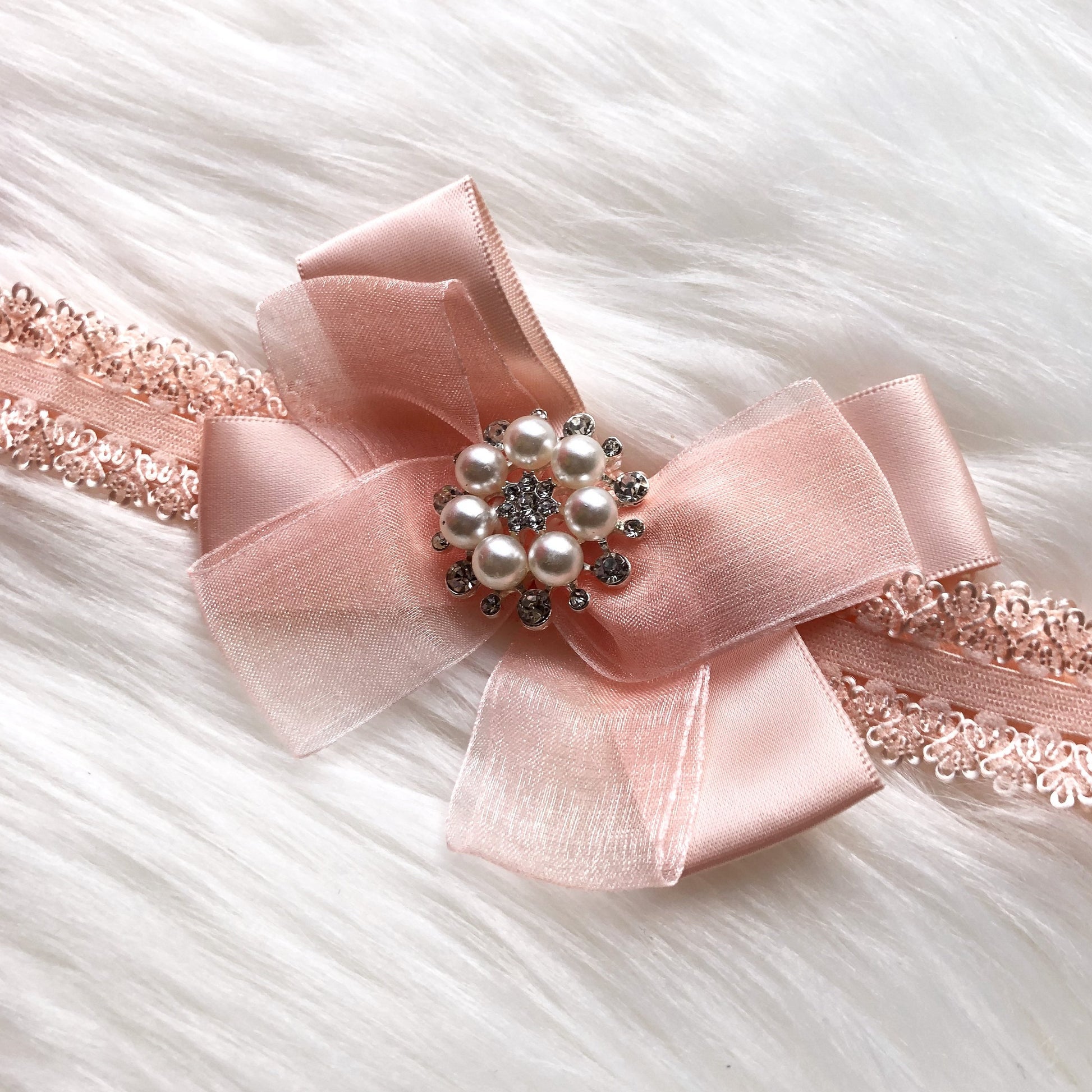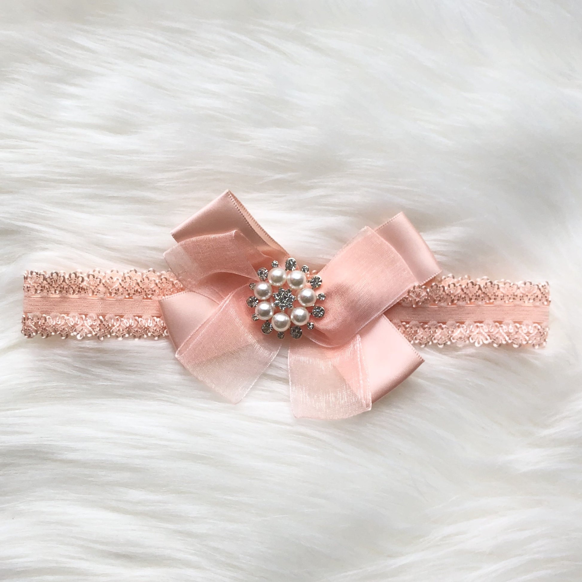 Beautifully decorated bow hairband with pearls and rhinestones. Great accessory for your little girls outfit or as a gift!