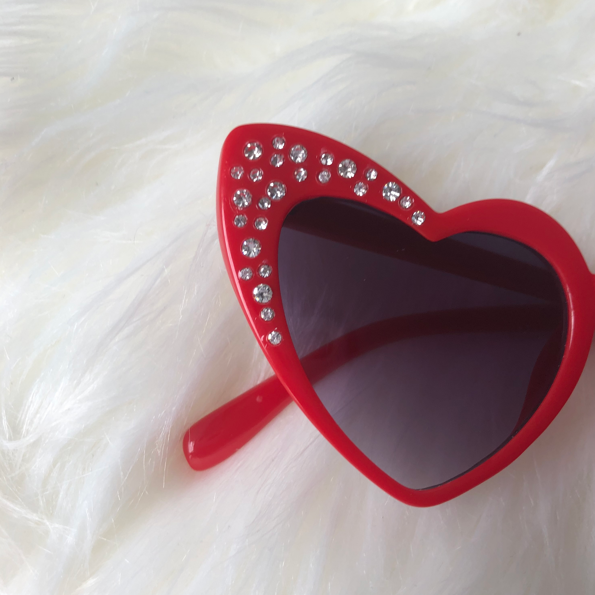 Cute heart-shaped plastic sunglasses for the princess with sass! Rhinestones adorn the outer edges of the sunglasses, and the heart shape is fun! Mom version available here!