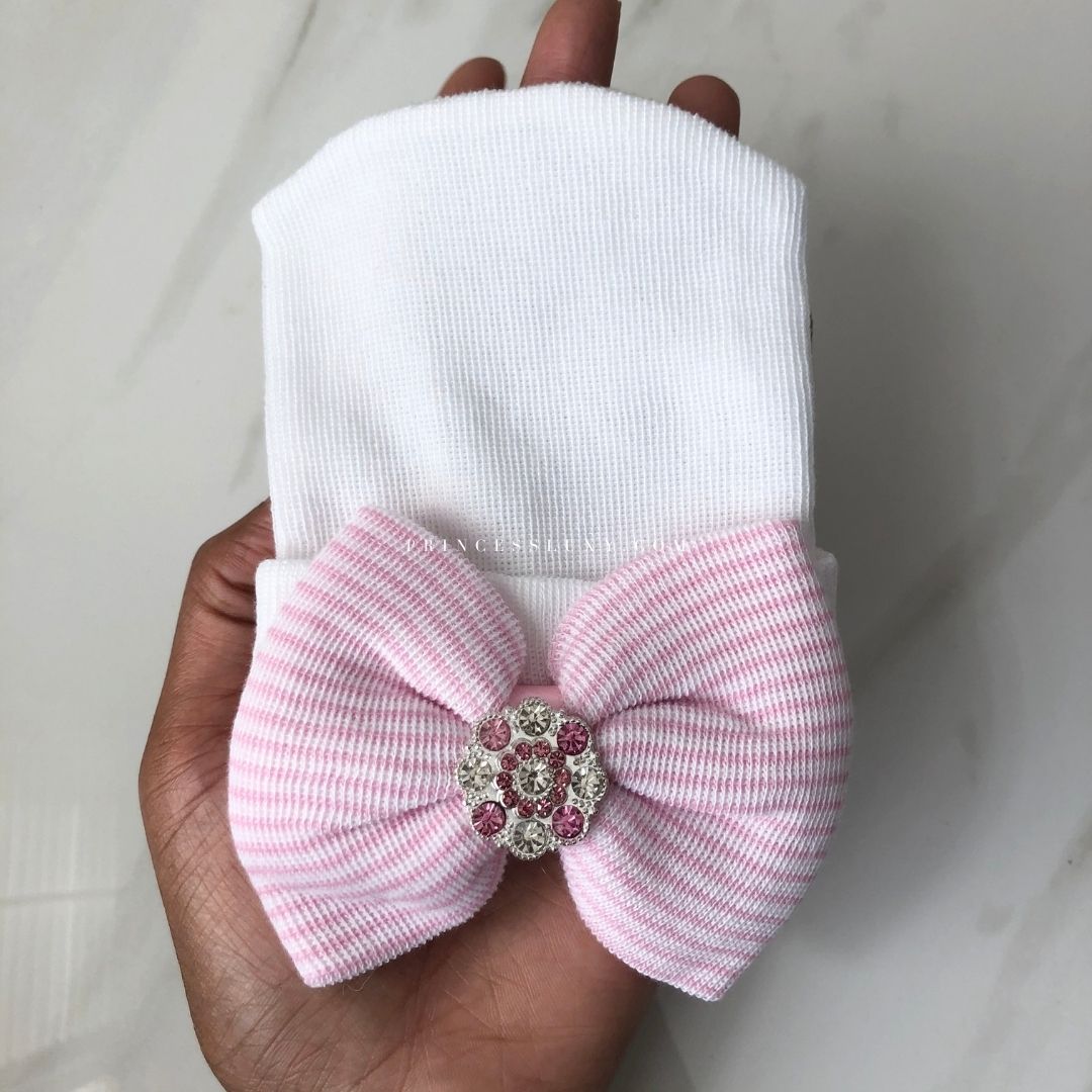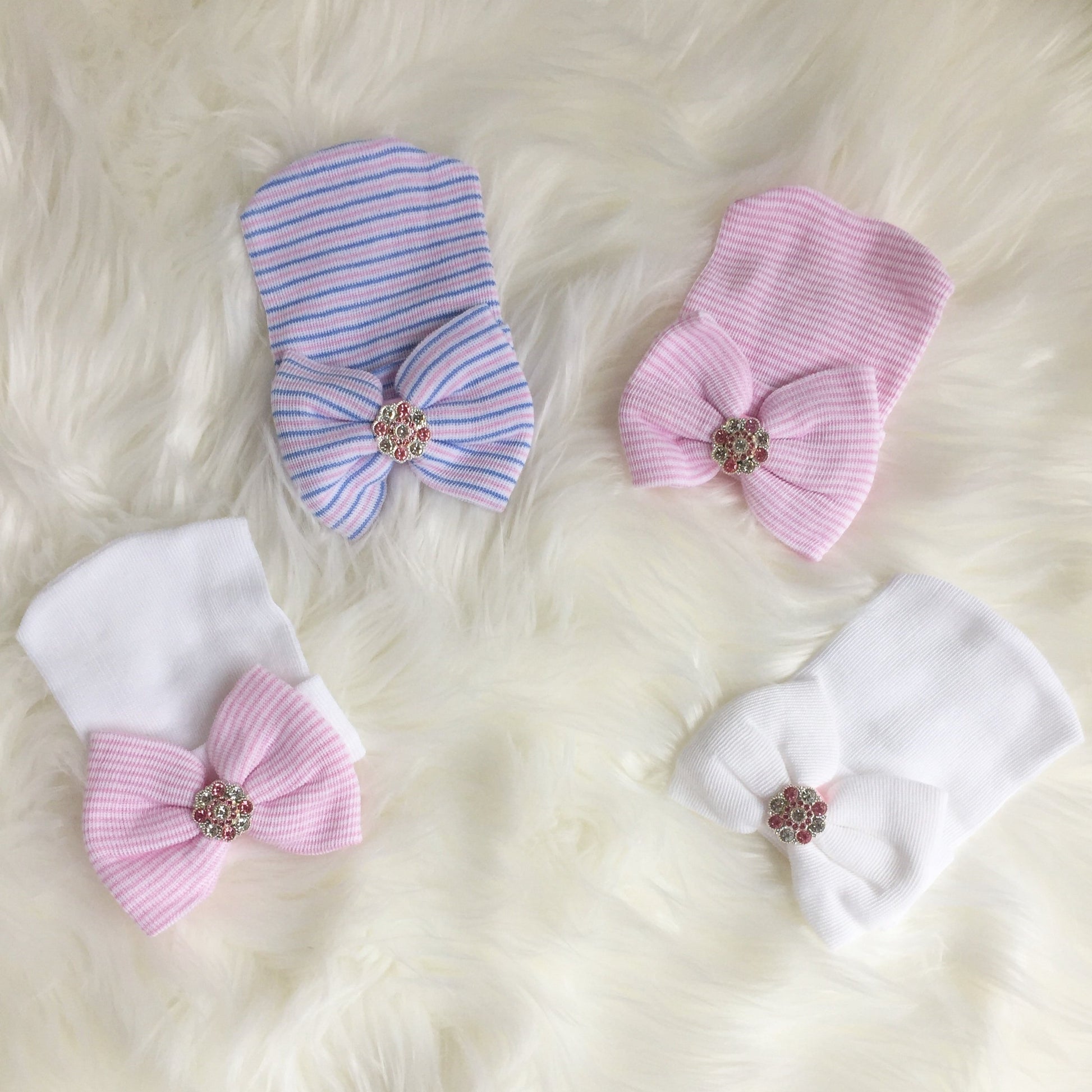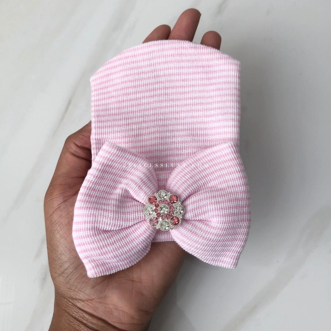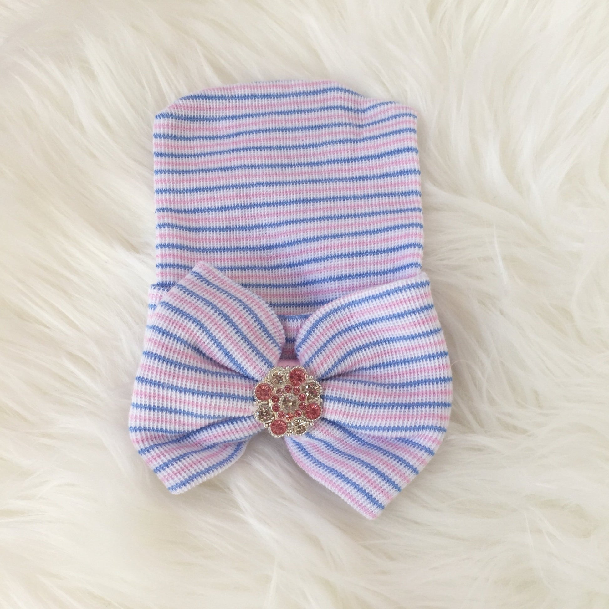 Our glitzy cotton newborn hospital hat is soft and unique. It is a great way to remember the birth of your child, as a keepsake, and have your newborn leave the hospital in style!
