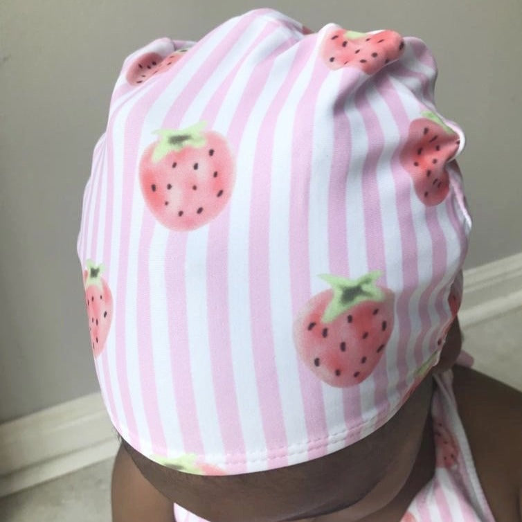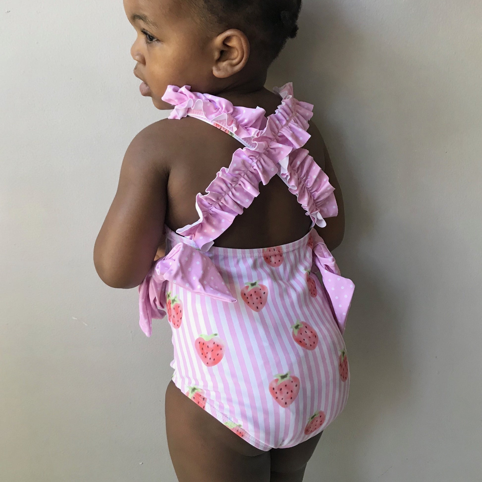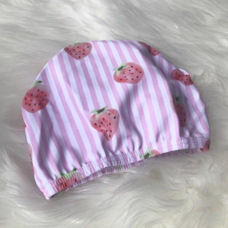 Our Strawberry Dream swimsuit is fashionable for her upcoming pool party and practical for everyday wear. The back features a pink polka dot crisscross pattern, accompanied by strawberry print, pink and white stripes, and pink bows on each side. Purchase includes a complimentary swim hat!